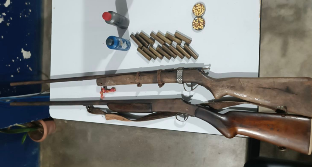 Diante das informações, a guarnição realizou diligências e conseguiu localizar o suspeito. Durante a abordagem, foram encontradas uma cartucheira calibre .32, uma espingarda de fabricação artesanal, munições deflagradas e materiais utilizados para antecarga.